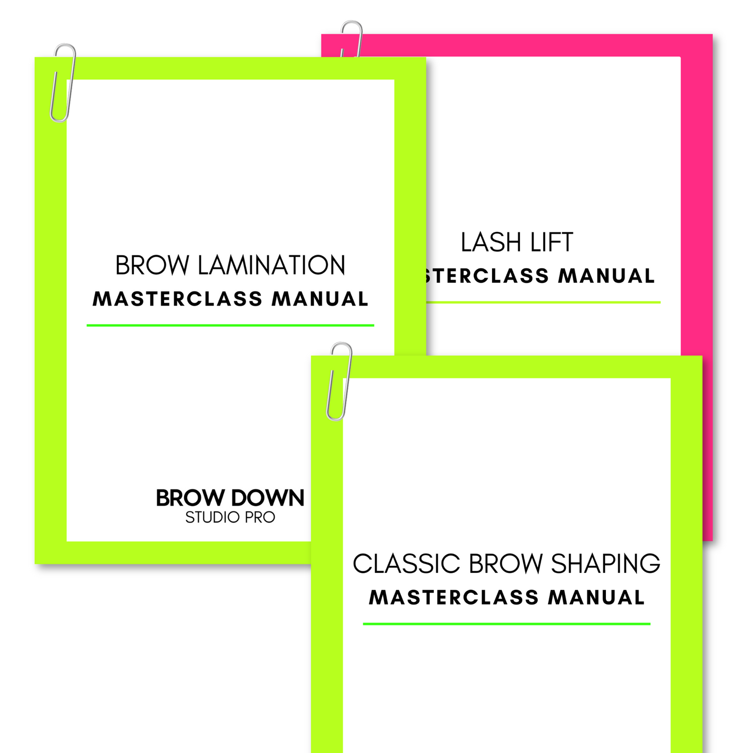 Our in-depth Masterclass Manuals contain 30+ pages of education on how to correctly perform professional services including Classic Brow Shaping, Brow Lamination, and Lash Lift.